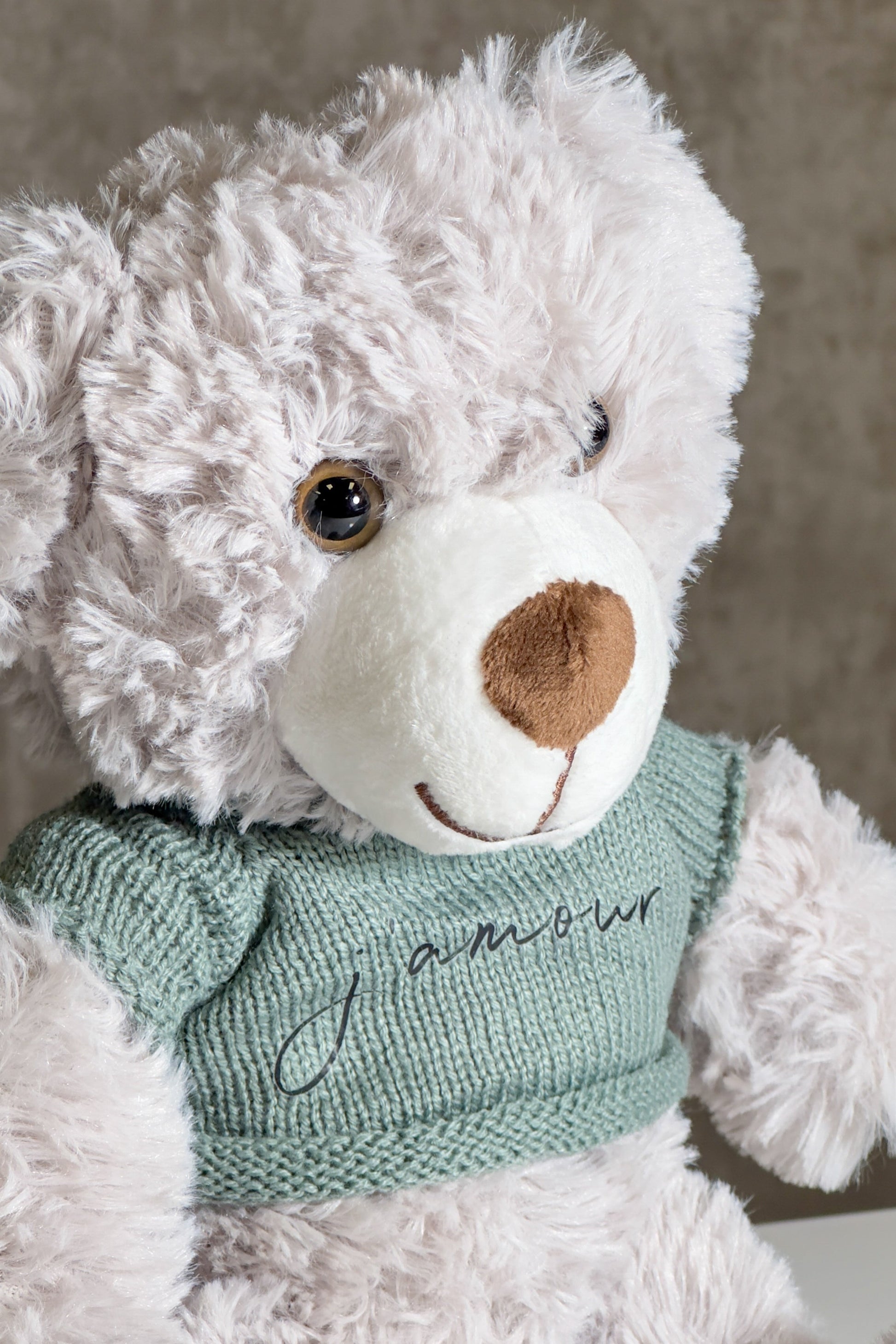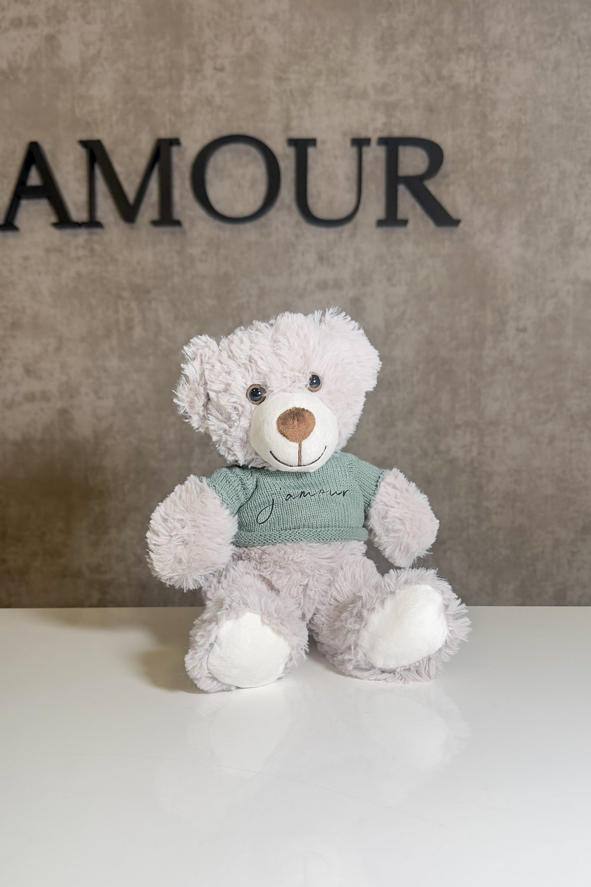 Meet Beau J., the soft grey bear with a peaceful presence and a whole lot of heart. Dressed in his knitted green sweater stitched with "j'amour", Beau is calm, comforting, and always ready to be by your side 💚.